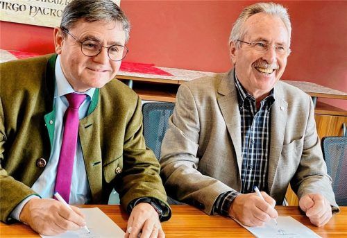 Mühldorfs Landrat Georg Huber und Altöttings Landrat Erwin Schneider (links) haben den Fusionsvertrag der beiden Kliniken Mühldorf und Altötting unterschrieben. Der Vertrag ist schon auf dem Weg zur Regierung von Oberbayern und soll schnell im Amtsblatt veröffentlicht werden. Das gemeinsame Kommunal