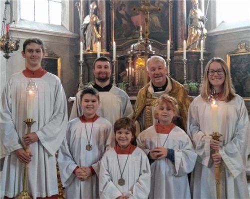 Neue Ministranten haben ihren Dienst in der Kirche St. Nikolaus in Mühldorf angetreten. Auf dem Bild (von links) Tobias Schmid, die drei neuen Minis Aaron Kohl, Martin Wiedl und Nora Hofmann und Susanne Bichlmeier sowie (hinten von links) Oberministrant Stefan Wimmer und Pfarrer Roland Haimerl. Foto