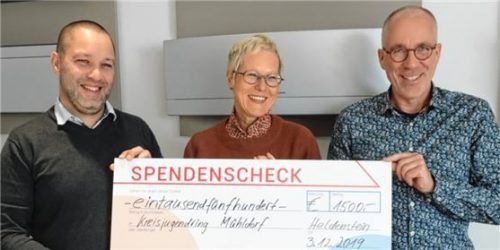 Kristin Hüwel, Geschäftsführerin des Kreisjugendrings Mühldorf, strahlte über das ganze Gesicht, als ihr Alexander Horn (rechts) und David Kretschmer, Geschäftsführer der Firma Horn Klima- und Kältetechnik in Heldenstein, einen Scheck über 1500 Euro überreichten. „Es brennt immer und solch eine groß