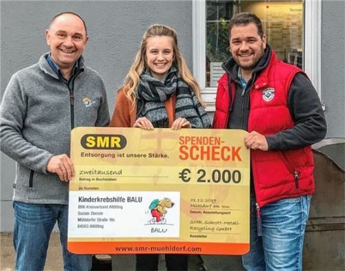Statt Weihnachtsgeschenken für Kunden und Geschäftspartner, hat die Firma SMR Recycling in Mühldorf 2000 Euro an die BRK Kinderkrebshilfe BALU gespendet. Joachim Hasler (links) von der Geschäftsleitung bei SMR und SMR-Betriebsleiter Michael Müller übergaben jetzt den Spendenscheck an Silvana Morgens