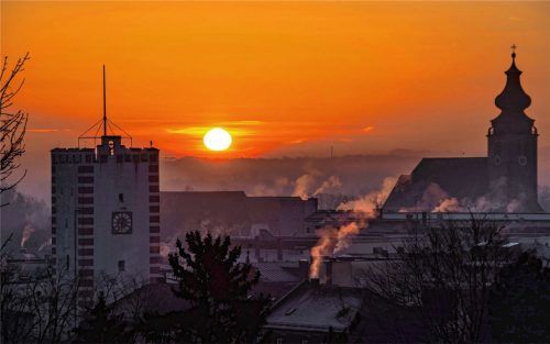 Mühldorfs magische Momente könnte man dieses Foto nennen, das Frühaufsteher und Leserreporter Rudolf Mayer aus Mühldorf gemacht hat. Der Sonnenaufgang, kombiniert mit den Rauchfahnen der Altstadtschornsteine, schafft derzeit morgens eine einzigartige Stimmung. Foto Mayer