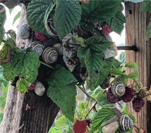 Einen Schnappschuss eines Himbeerstrauchs, der voll von Schnecken ist, machte die Leser-Reporterin Gertraud Krämer aus Oberneukirchen in ihrem Garten. Die Schnecken, sogenannte „Bauchfüßer“, scheinen genau zu wissen, was gut schmeckt, und machten sich in Scharen über die reifen Himbeeren her. Foto k