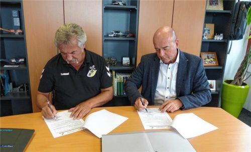 Streumaster-Geschäftsführer Andreas Marquardt (rechts) und Reinhold Weber (links), Vorsitzender des FC Egglkofen, unterzeichneten einen Sponsorenvertrag, der eine 40 Meter lange Bandenwerbung beinhaltet. Außerdem wird die dritte Mannschaft Trikots mit der Werbung des Sponsors tragen. Der Vertrag wur