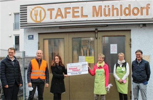 Die Mühldorfer Volksbank Raiffeisenbank unterstützt die Tafel mit einer Spende von 2500 Euro. Auf dem Bild zu sehen: (von links) Bürgermeister Michael Hetzl, Detlef Künzel, Leiter der Mühldorfer Tafel, Geschäftsstellenleiterin Stefanie Blaumoser von der Volksbank Raiffeisenbank Mühldorf, die ehrenam