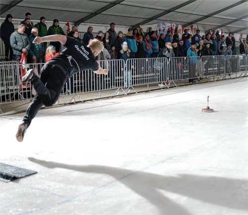Alex Anzinger schießt den Stock nach vorne. Der Schwung reißt ihn sogar vom Boden weg. Fotos Purucker
