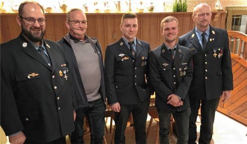 Bei der Jahresversammlung der Feuerwehr Egglkofen überreichten der scheidende Kreisbrandrat Harald Lechertshuber und Bürgermeister Johann Ziegleder die Beförderungen an vier Feuerwehrleute. Die verdienten Beförderungen nahmen mit Stolz entgegen: Daniel Ostermeier und Manuel Maier zu Hauptfeuerwehrmä
