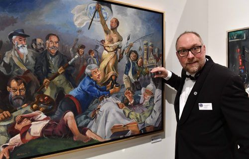 „150 Jahre sind ein dickes Brett“ beginnt Paul Martin Cambeis seine Eröffnungsrede im Souterrain des Ägyptischen Museums. Cambeis ist der aktuelle Präsident der Münchner Künstlergenossenschaft (MKG). Anlässlich des Jubiläums hat der begnadete Comic-Zeichner ein eigenes Bild gemalt.