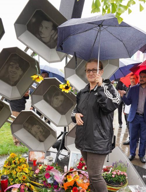 Eine besondere Stille herrscht am Olympiaeinkaufszentrum. Und der Himmel weint mit den Angehörigen. Nazmije Sagashi kniet sich nieder. Sie hebt ihre rechte Hand, legt sie schützend auf das Bild ihrer Tochter Armela, streichelt liebevoll über ihr Gesicht. So als wäre Armela wirklic