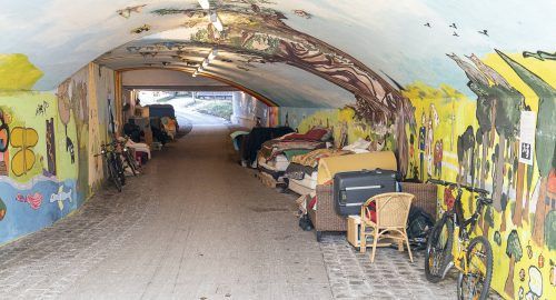 Etwa 20 Wohnungslose haben in der Unterführung unter der Kapuzinerstraße in der Isarvorstadt ihre Nachtquartiere aufgeschlagen. Sie haben Matratzen gestapelt, hüllen sich nachts in dicke Schlafsäcke. Weil der Wind durch die Unterführung pfeift und um ein Minimum an Privatsphäre