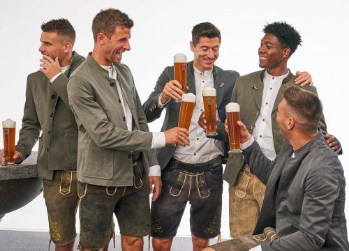 Robert Lewandowski (Mitte) zeigte in perfekt sitzender Tracht sein breitestes Zahnpastalächeln und prostete den Kollegen Thomas Müller (2. v. li.), David Alaba (2. v. re.) und Niklas Süle (vorne re.) vergnügt mit Weißbier zu. Nur 80-Millionen-Neuzugang Lucas Hernández schien sich noch zu fragen, was