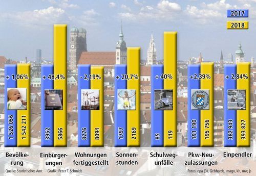 Vom Millionendorf zur Metropole. Das ist München im Jahr 2019. Muss man nicht gut finden. Ist aber so. Beweismaterial für das internationale Flair und die expandierende Stadt liefert das Statistische Amt. Wer etwa die Zahl der angemeldeten Autos betrachtet sowie das immense Plus an A