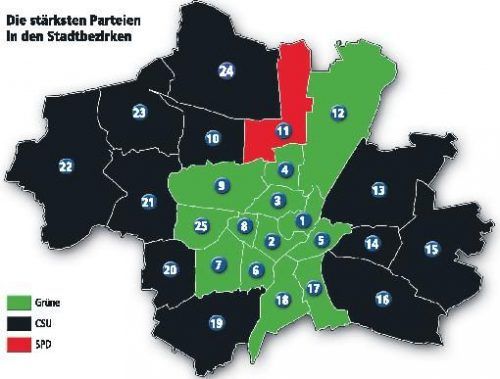 Die Grünen können bei der Stadtratswahl an ihre Erfolge bei der Landtags- und Europawahl anknüpfen. In 13 von 25 Bezirken werden sie stärkste Kraft. Die CSU liegt elfmal vorne, vor allem am Stadtrand. Die SPD kann einzig den Stadtteil Milbertshofen-Am Hart erobern.