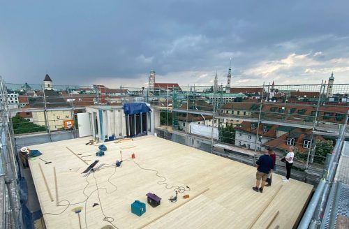 Der erste Bolzplatz über den Dächern der Stadt nimmt Gestalt an: Die Zimmerer- und Dachdeckerarbeiten sind abgeschlossen, der Dachstuhl auf dem Gebäude von Bellevue di Monaco an der Müllerstraße 6 ist fertig. Am Donnerstag ist Richtfest. Wie berichtet, sollen Kinder und Jugendliche auf dem „Kurt- La
