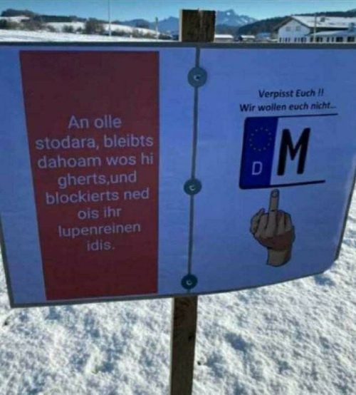 Das Münchner Autokennzeichen, ein erhobener Mittelfinger und die unflätige Aufforderung „Verpisst Euch!“: So wurden Ausflügler aus der Landeshauptstadt am Silvestertag in Miesbach begrüßt. Das zusammengezimmerte Schild am Ortseingang hat