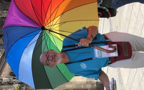 Eigentlich erklärt Hermann Beckmann anderen den Weg. Er zeigt, wo es Schnelltests gibt, und hilft Touristen, wenn sie Fragen haben. Gestern aber, vor dem EM-Spiel der Deutschen gegen Ungarn, hat der freiwillige Helfer eine weitere Aufgabe: Er setzt ein Zeichen