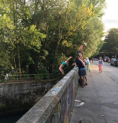 Mit einem lauten „Platsch“ landen sie im Wasser. Als Kerze, Bombe, mit einem Salto oder per Kopfsprung. An vielen Brücken im Stadtgebiet sieht man sie derzeit: In hohem Bogen springen Jugendliche in die Isar und den Werkkanal. Sie haben sichtlich Spaß, tauchen mit einem Lachen im