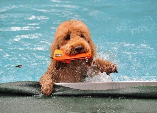 Auf die Plätze, fertig – Platsch! Aufgeregt springt Hund Sheela dem Ball hinterher: ab ins Becken. Patschnass kommt sie aus dem Wasser, schüttelt sich ausgiebig und bringt ihrem Herrchen das Spielzeug zurück. „Ball und Wasser: Das macht Sheela glücklich!“, sagt Raul Burtea.