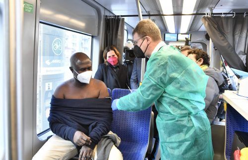 Sonderfahrt steht auf der Anzeige der Tram, die am Wettersteinplatz Halt gemacht hat. Sie sieht anders aus als eine normale Straßenbahn: Die Fenster sind mit Sichtschutz-Folien beklebt, zwischen einigen Sitzplätzen sind Ablageflächen eingebaut und graue Vorhänge trennen einzelne