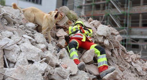 Hoch konzentriert steht der Hund mit den eisblauen Augen vor dem riesigen Trümmerhaufen. Die Hundeführerin nimmt ihm Leine und Halsband ab, beugt sich zu Aquim runter: „Such und hilf!“ – er flitzt los. Beinahe mühelos erklimmt er den meterhohen Berg, klettert geschi