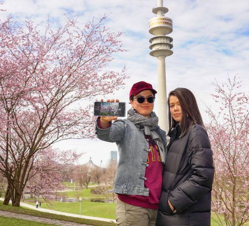 Seit Anfang der Woche sind die Kirschblüten am Fuße des Olympiabergs regelrecht explodiert. Auch die Schwestern Elisabeth (26) und Kornelia (22) sind begeistert. „Wir wohnen in der Nähedes Olympiaparks und kommen gerne hierher – es ist einfach nur schön“, sch