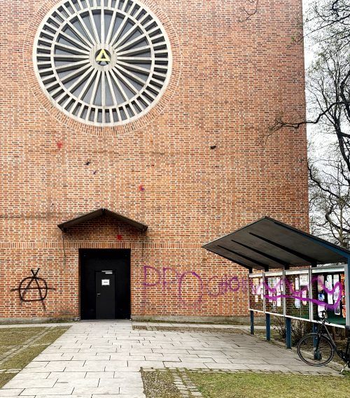 In der Nacht zu Samstag wurde die katholische Kirche Maria vom guten Rat verschandelt. Bislang unbekannte Täter beschmierten die Kirche mit Schriftzügen. Anwohner berichten von Linksautonomen, die dafür verantwortlich sein sollen. Zudem seien Farbbeutel geworfen worden. Gestern Mittag waren die meis