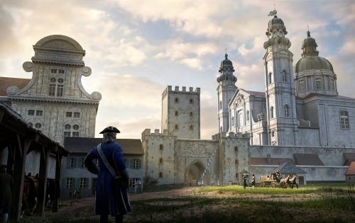 Die blau-weiße Schranke zum Tor der Stadtmauer öffnet sich. Eine Kutsche, beladen mit Holzfässern, macht sich auf den Weg. Die Hufe der beiden Pferde schlagen schwer auf den sandigen Boden. Im Hintergrund ragen die Türme der Theatinerkirche in den Münchner Himmel.