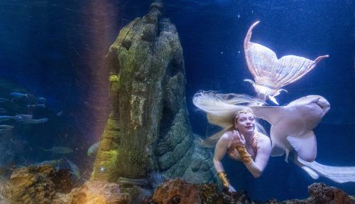 Wer ist hier Fisch, wer Mensch und wer irgendwas dazwischen? Diese Begegnung im Hai-Becken des Münchner Sea Life Aquarium im Olympiapark dürfte sowohl für den Hai als auch für die Meerjungfrau Daniela Rodler eine eher ungewöhnliche gewesen sein. Der Grund für diese Aktion: An den vier kommenden Sams