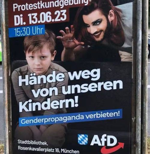 Im Stadtgebiet wirbt ein Plakat der bayerischen Alternative für Deutschland (AfD) derzeit für eine Protestveranstaltung. Die Demo der Partei steht im Zusammenhang mit der umstrittenen Kinderlesung eines Drag-Künstlers in der Bogenhauser Stadtbibliothek am Dienstag (wir berichteten).