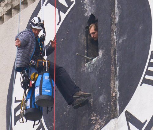 Ganz behutsam, mit weißen Schutzhandschuhen bekleidet, trägt Baureferentin Jeanne-Marie Ehbauer den 3,25 Meter langen und 24 Kilo schweren großen Gold-Zeiger zum Alten Peter. Dann ziehen professionelle Industrie-Kletterer die beiden neuen Schmuckstücke langsam Stück für Stück nach ob
