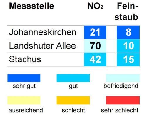 Das Bayerische Landesamt für Umwelt meldete gestern um 16 Uhr folgende Werte (Mikrogramm pro Kubikmeter; Feinstaub PM10: gleitender 24-Stunden-Mittelwert; Stickstoffdioxid: höchster 1-Stunden-Mittelwert im Zeitraum 0 bis 16 Uhr, gesetzlicher Stunden-Grenzwert 200 µg/m³).