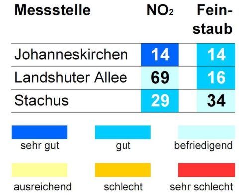 Das Bayerische Landesamt für Umwelt meldete gestern um 16 Uhr folgende Werte (Mikrogramm pro Kubikmeter; Feinstaub PM10: gleitender 24-Stunden-Mittelwert; Stickstoffdioxid: höchster 1-Stunden-Mittelwert im Zeitraum 0 bis 16 Uhr, gesetzlicher Stunden-Grenzwert 200 µg/m³).