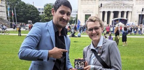 Stunk um einen Sticker: Beim Stadtgründungsfest und am Rande der Demo gegen Rechts am Königsplatz posiert der Vize-Vorsitzende des Migrationsbeirates Arif Haidary mit Beirats-Mitglied Klara Sch