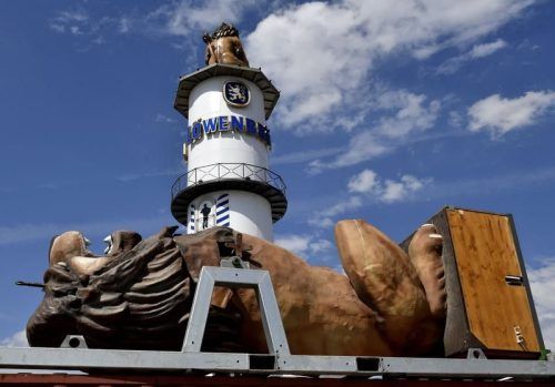 Noch liegt der Löwenbräu-Löwe auf einem Baustellen-Co