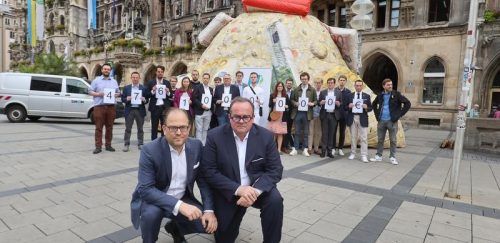 Vertreter der CSU und der Jungen Union zeigen symbolhaft, wie hoch der Schuldenberg der Stadt ist. © Markus Götzfried