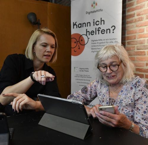 Wertvolle Tipps: IT-Referentin Laura Dornheim (li.) erklärt Heidi Lehmann den Umgang mit Tablet und Handy. © Schlaf