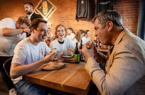 Agnes Brücklmayer mit Ministerpräsident Markus Söder beim Döner-Essen in München. © Yannick Thedens