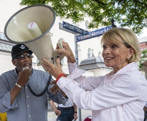 Schauspielerin Uschi Glas engagiert sich gegen Rechtsextremismus, Rassismus, Hass und Hetze. Auf dem Münchner Viktualienmarkt sammelte sie jetzt Unterschriften für eine Aktion von Alt-