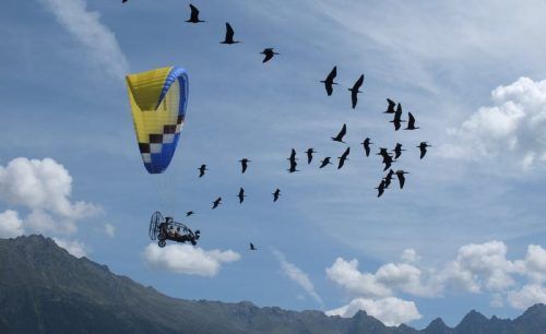 Es ist ein kurioser Anblick: Ein Ultraleicht-Fluggerät zieht mit einem Vogelschwarm über den Himmel. Dieser Anblick ist mit einer guten Nachricht für den Schutz des Waldrapps und seine Wiede