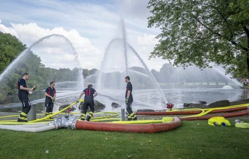 Wasser marsch für die Fische! Mit vereinten Kräften schießt die Feuerwehr Wasserfontänen in den viel zu warmen See