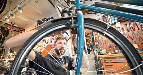 Es herrscht rege Betriebsamkeit im „Fahrradladen Prinzenstraße“, Hausnummer 83: Junge Eltern suchen einen Helm für ihr Kleinkind, eine Seniorin will ihr repariertes E-Bike abholen, eine Studentin begutachtet