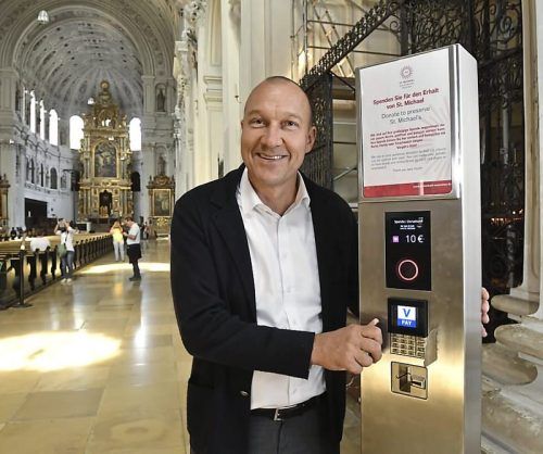Pater Martin Stark neben der neuen bargeldlosen Spendensäule © Marcus Schlaf