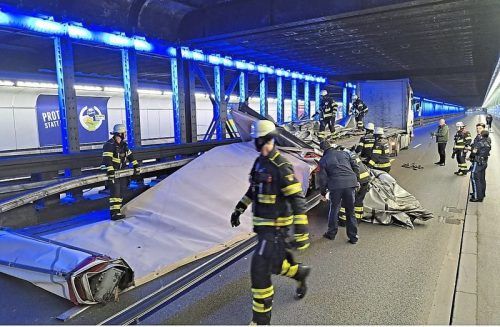 Die Feuerwehr sammelte die Teile ein. Das Gespann war zu hoch für die Unterführung. © Feuerwehr