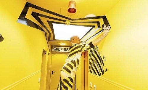 Tape-Art Künstler Felix Rodewaldt bei der Arbeit (gr. Bild) im ehemaligen Happy End Hotel (unten links). Sie organisieren die Ausstellung: Julia Fanta (v. li.), Daniele Faggiotto und Fillin Guas vom Künsterkollektiv broke.today (rechts). © Oliver Bodmer (6)
