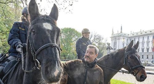 Ministerpräsident Markus Söder begrüßt am Donnerstagmorgen Beamte der berittenen Polizei im Problempark. © Oliver Bodmer (3)