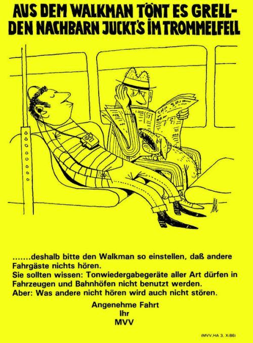 Eine Frau telefoniert in der U-Bahn. Auf dem Bild rechts ist ein Plakat zu sehen, mit dem der MVV schon vor Jahrzehnten für mehr Rücksichtnahme warb. © Klaus Haag, Hürlimann