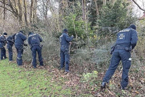 Messer gesucht: Bereitschaftspolizisten durchkämmten am Mittwochmorgen die Umgebung des Tatorts. © Hoffmann (2), Thedens