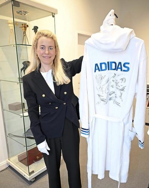 Wohl eines der begehrtesten Objekte: Sotheby‘s-Mitarbeiterin Elisabeth Bonse mit einem Bademantel samt Fußballer-Unte