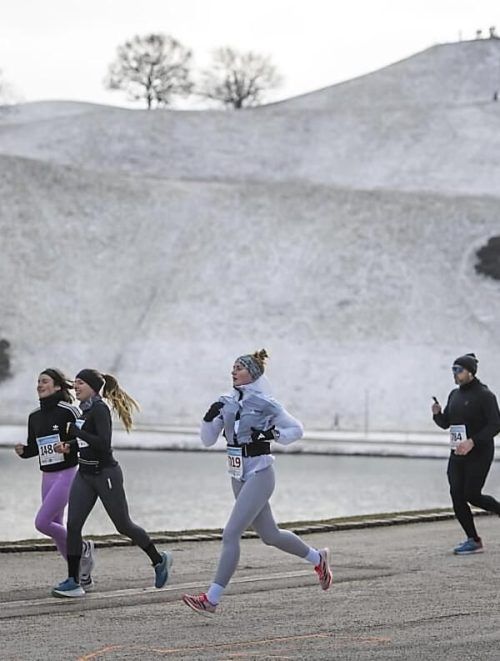 Bei Eiseskälte und herrlich frischer Winterluft sind am Samstag hunderte Läufer durch den Olympiapark gejoggt – wie hier am Olympiasee mit dem verschneiten Hügel im Hintergrund. Es war der Abschluss der Münchner Winterlaufserie. Auf einem fünf Kilometer langen Rundkurs ging es durch den Park, bei de