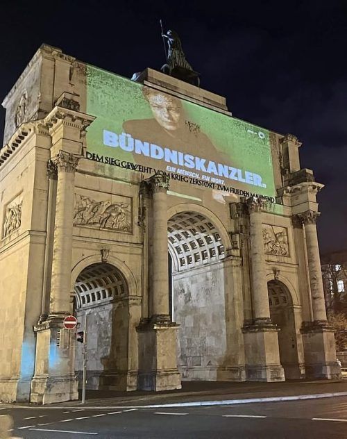 Verboten: Grüne projizieren am 3. Januar Habeck-Werbung ans Siegestor. © Uli Heichele
