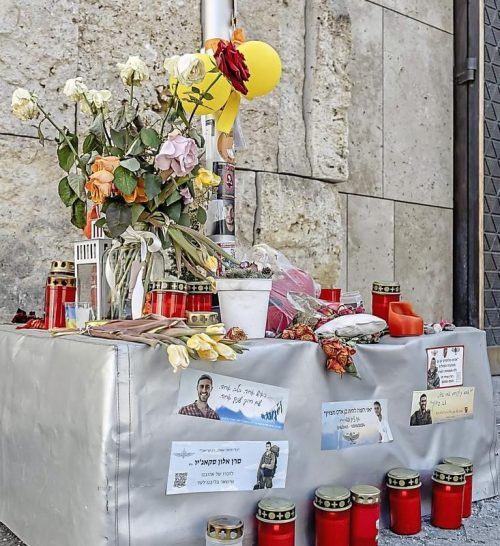 Es sind Andenken an die Geiseln, die am 7. Oktober 2023 von der Hamas entführt wurden. Erinnerungen an Soldaten aus Israel, getötet im Krieg. Kerzen, Blumen und Fotos vor der Münchner Synagoge sollen die Schrecken